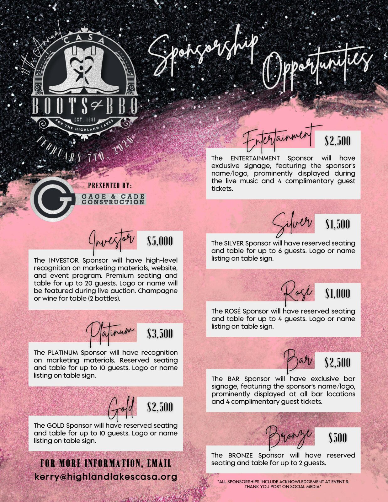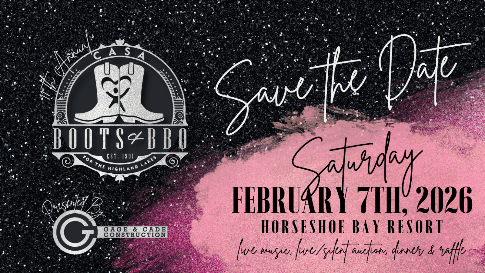 Dust off your boots and join us for a night of Texas-sized fun — all for a great cause! The 11th Annual Boots & BBQ, benefitting CASA for the Highland Lakes Area, is our signature fundraising event of the year.
